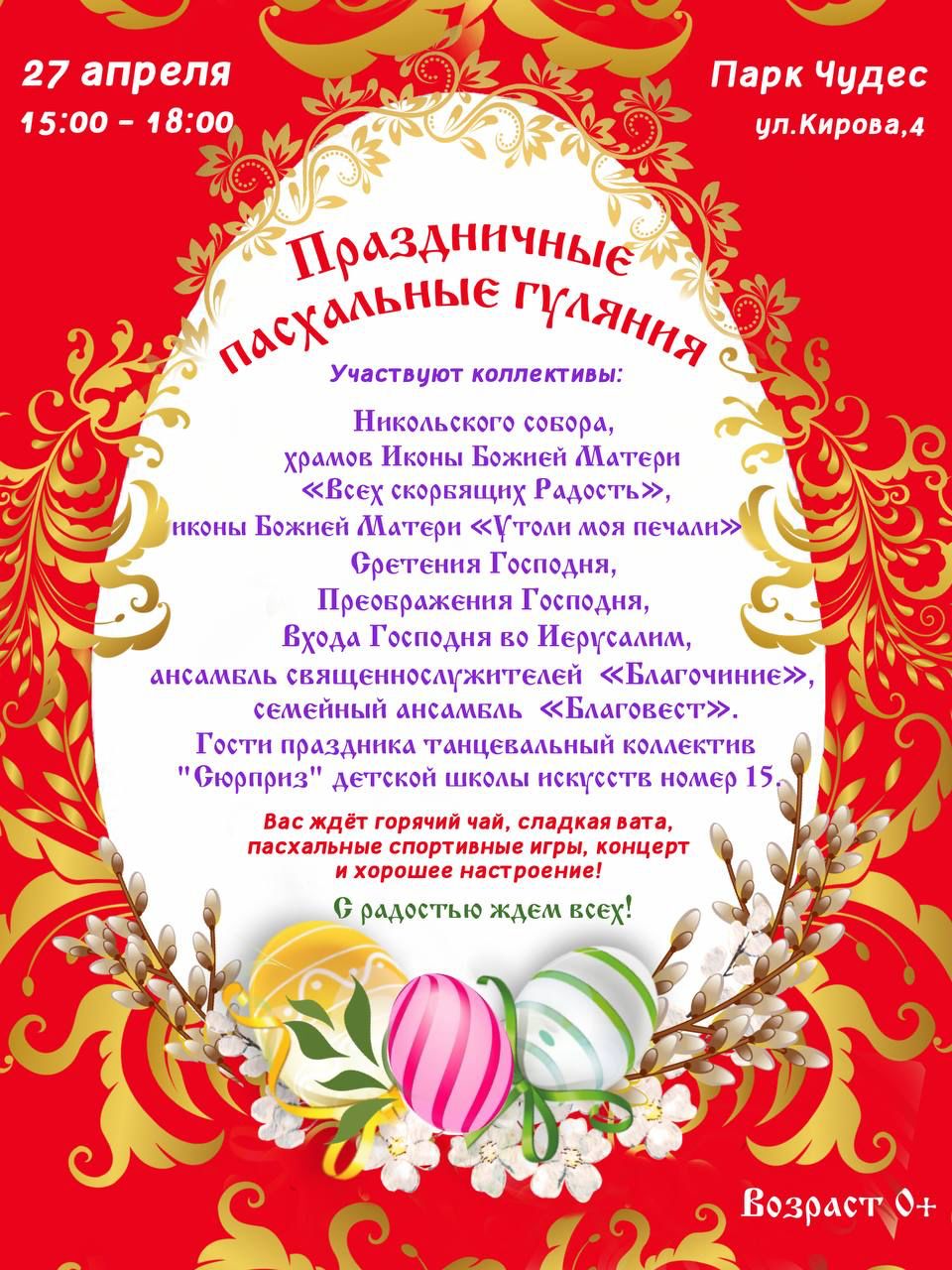 С радостью приглашаем всех на Праздничное Пасхальное гуляние, которое состоятся 27 апреля с 15:00 до 18:00 в воскресенье Светлой Седмицы в Кемеровском «Парке чудес»!
